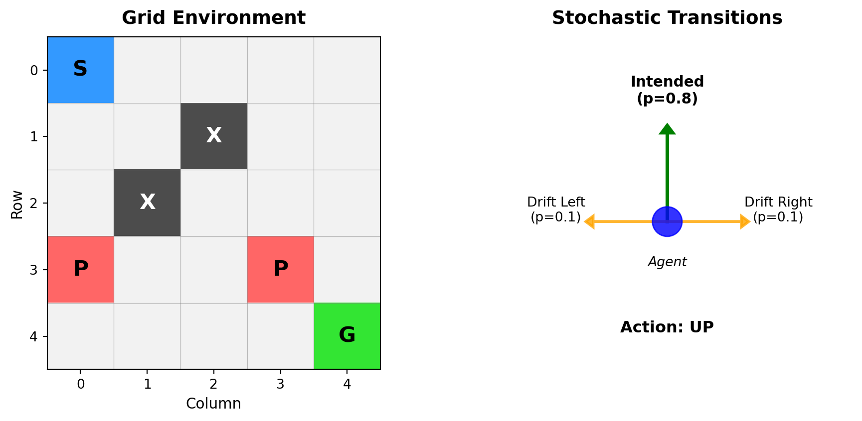 - \(P(s_{\text{east}}|s, \text{UP}) = 0.1\) (drift right)