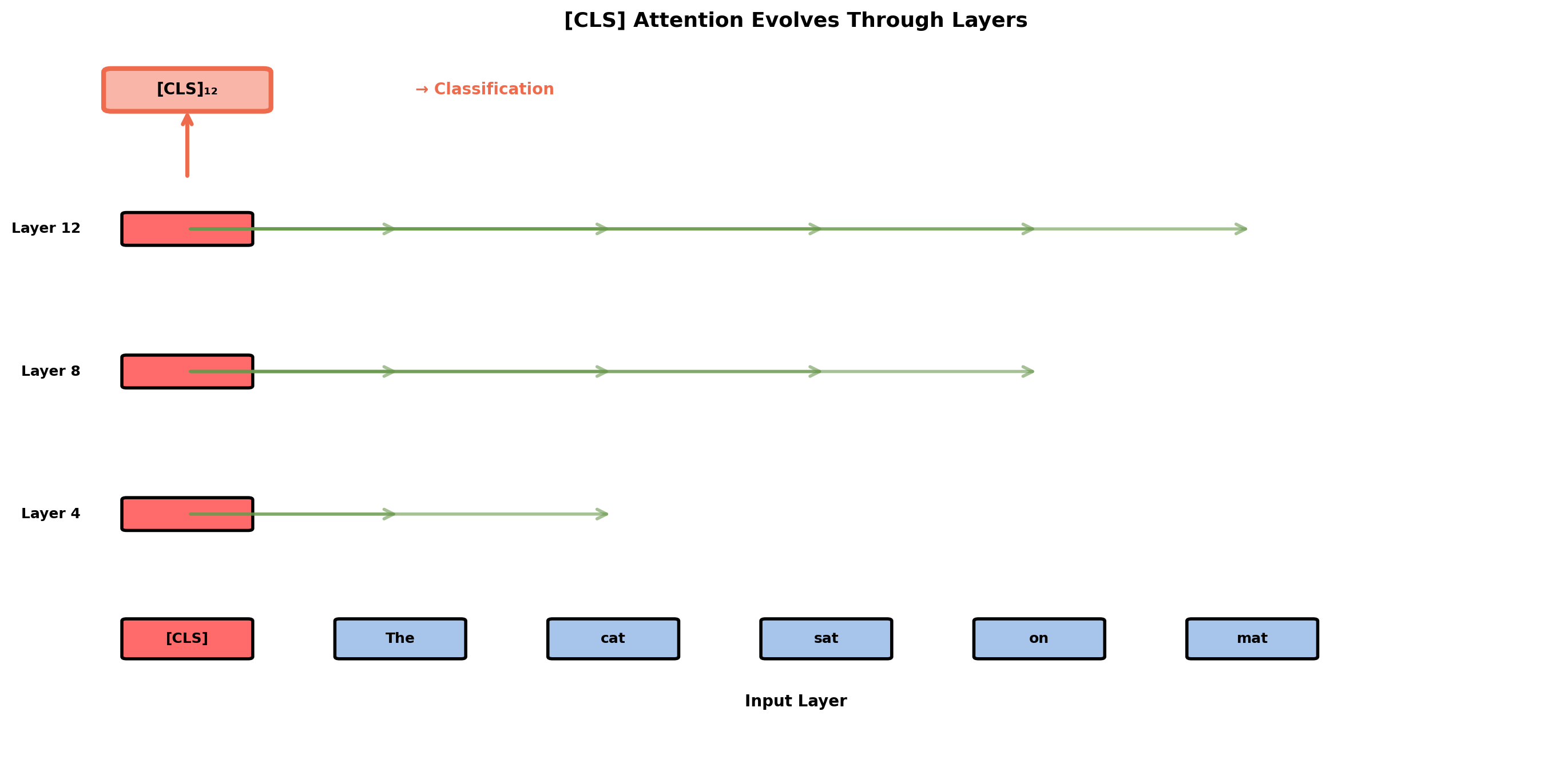 Final [CLS] representation \(\mathbf{h}_{\text{[CLS]}}^{(12)} \in \mathbb{R}^{768}\) passed to task head:
