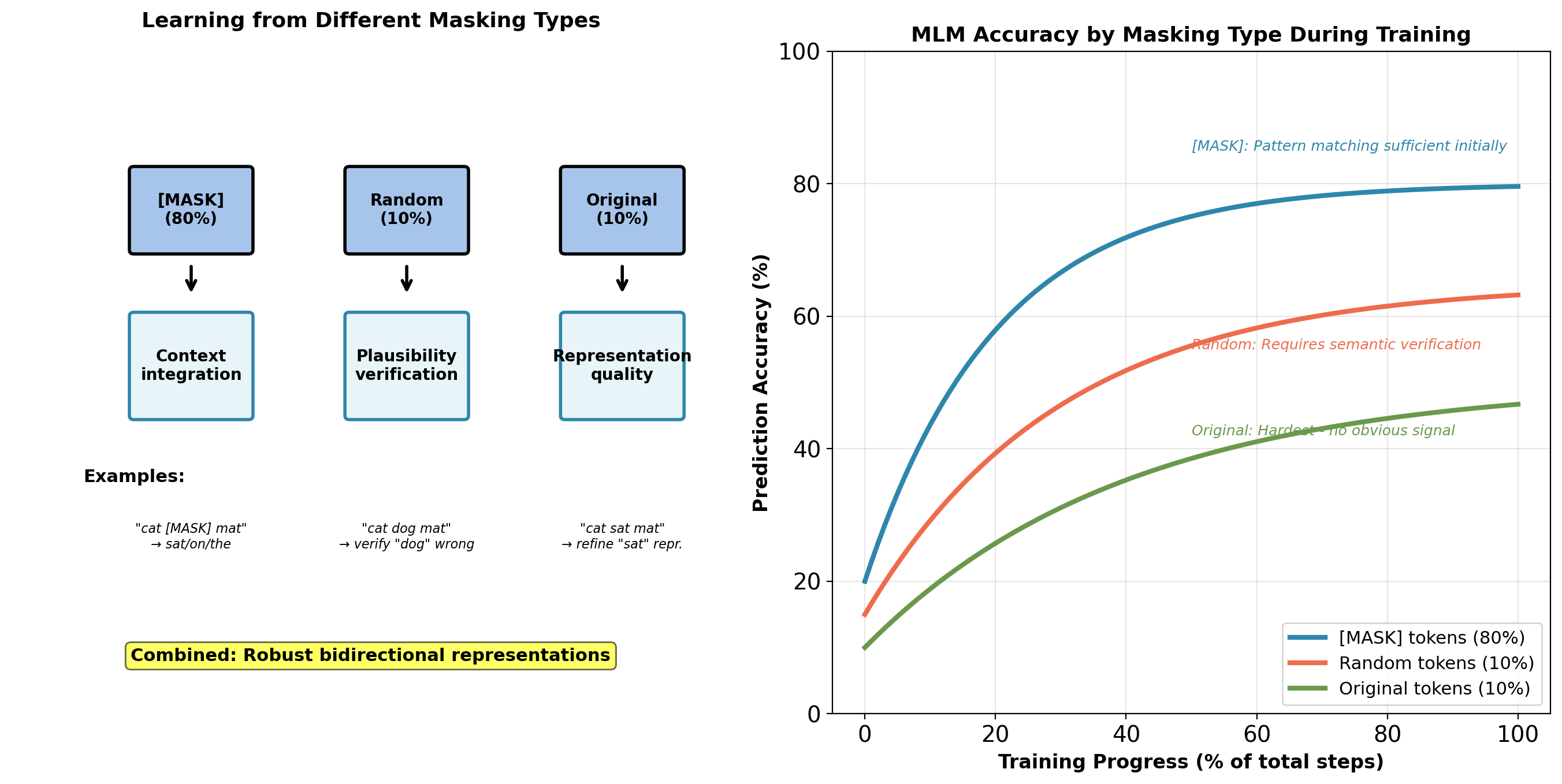 [MASK] tokens: Model learns fastest. Clear corruption signal.