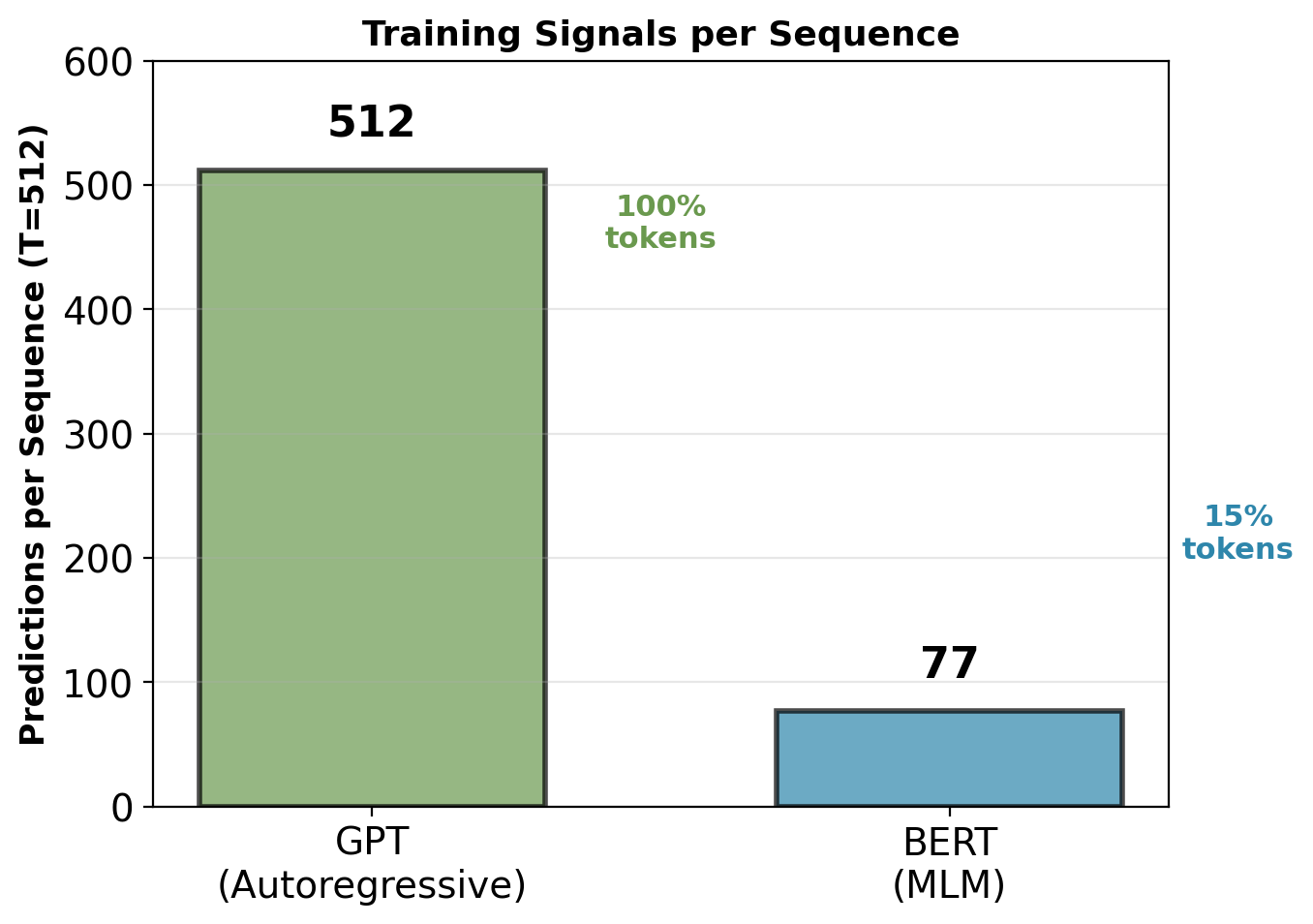 For T=512 sequence: 77 predictions (15%), each using full context.