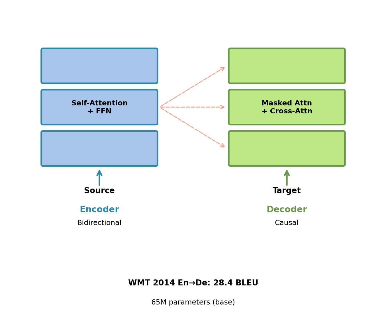 Encoder-decoder: Encoder positions bidirectional, decoder positions causal with cross-attention.