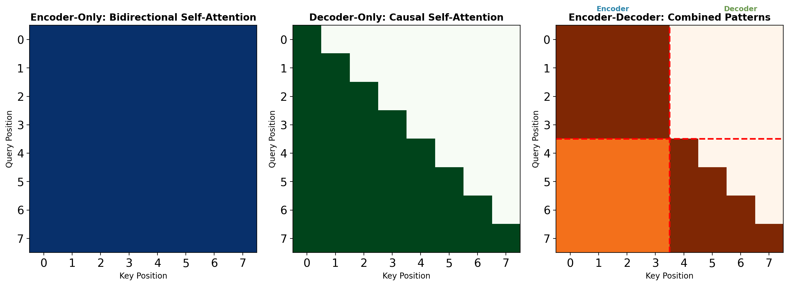Decoder-only: Position \(i\) attends only to positions \(j \leq i\) (lower triangular).