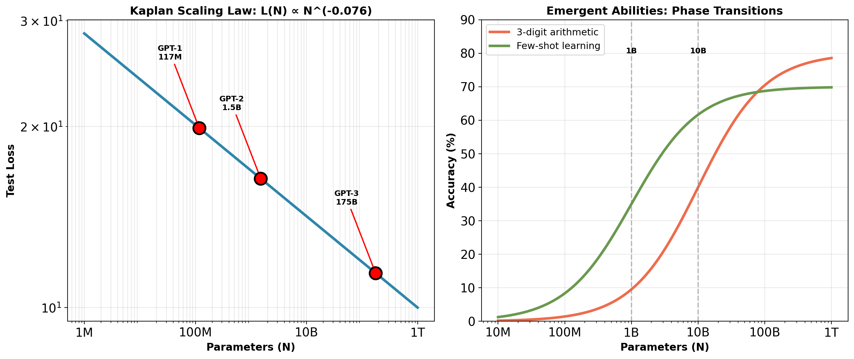 Left: Test loss decreases smoothly as power law in parameters (Kaplan et al., 2020)