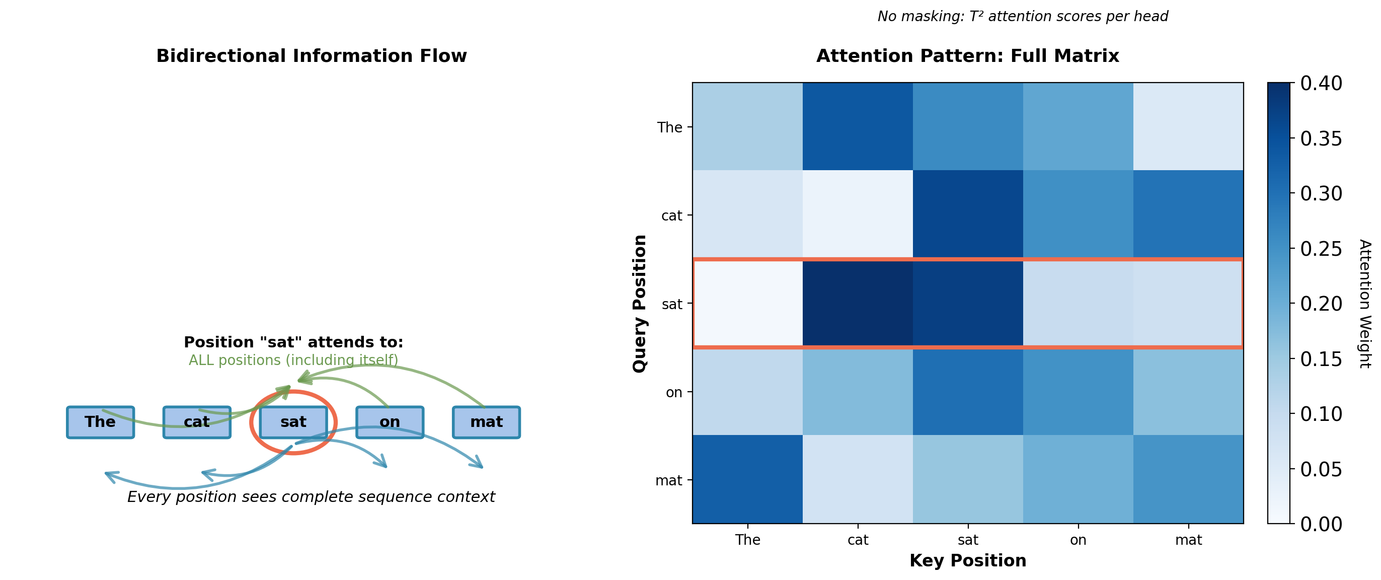 Encoder-only: All positions attend to all positions simultaneously.