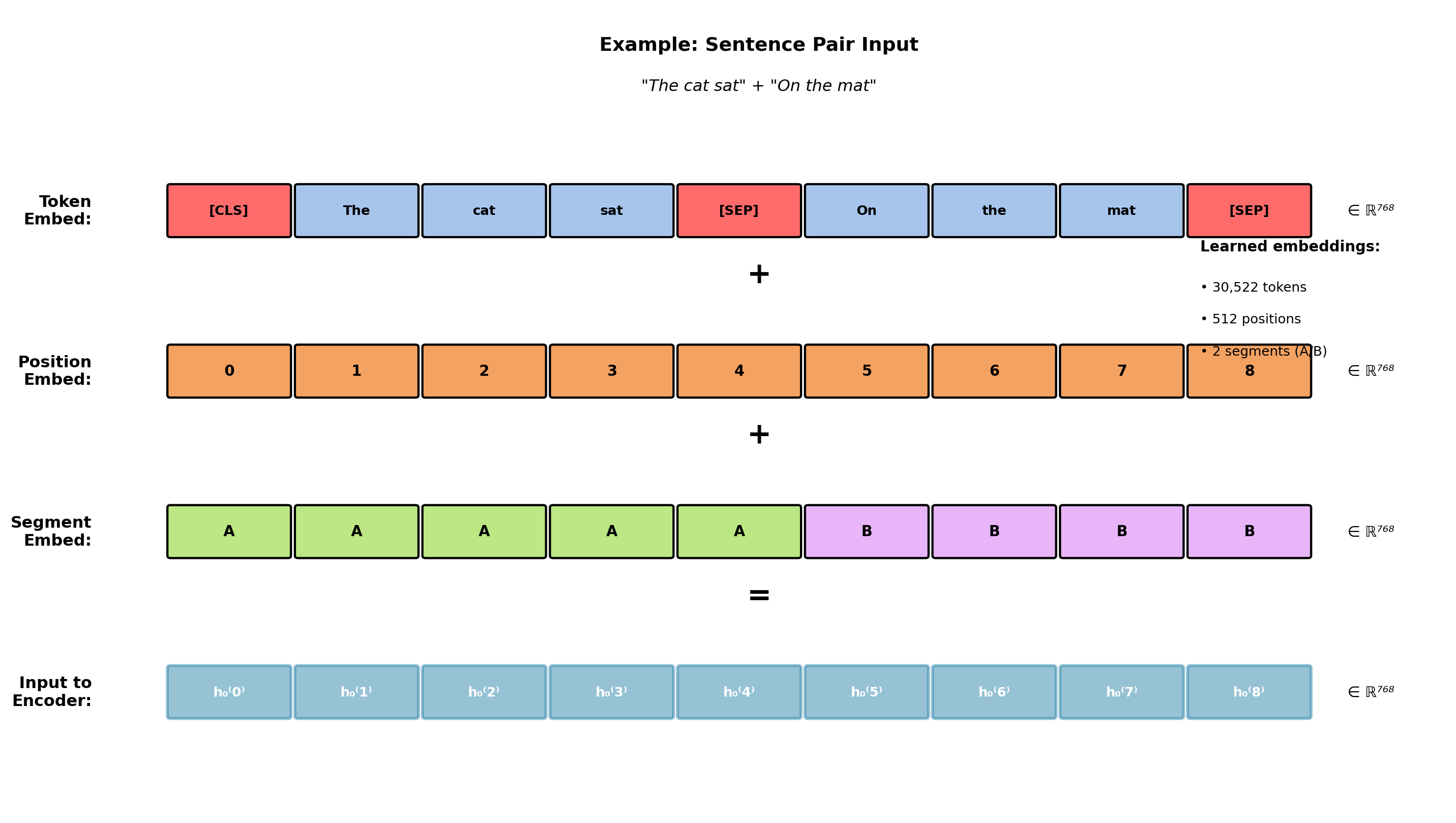 \[\mathbf{h}_0^{(i)} = \mathbf{E}_{\text{token}}[x_i] + \mathbf{E}_{\text{position}}[i] + \mathbf{E}_{\text{segment}}[s_i]\]